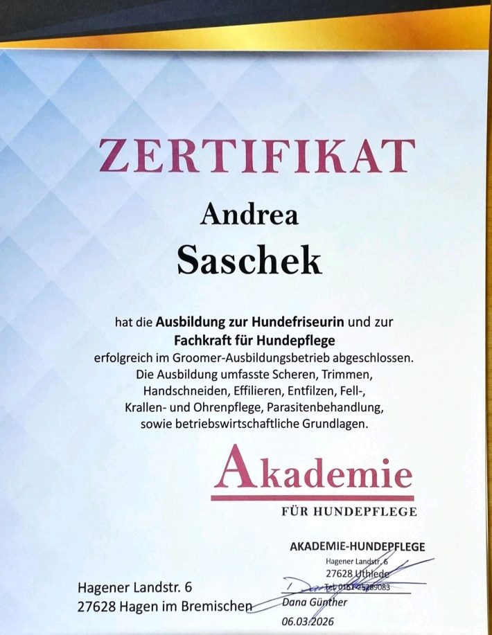 Mein Name ist Andrea Saschek und ich lebe seit 2011 mit meiner Familie in Gimbte. Als studierte Rehabilitationspädagogin habe ich viele Jahre mit Menschen gearbeitet und erfülle mir nun mit meinem eigenen Hundefriseursalon einen großen Lebenstraum.